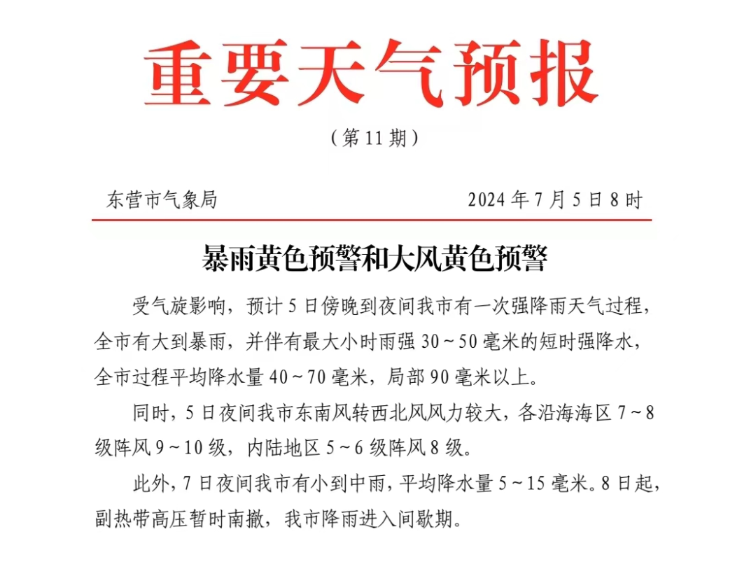 東營市氣象局7月5日8時(shí)發(fā)布暴雨黃色預(yù)警和大風(fēng)黃色預(yù)警受氣旋影響預(yù)計(jì)5日傍晚到夜間東營市有一次強(qiáng)降雨天氣過程全市有大到暴雨并伴有最大小時(shí)雨強(qiáng)30~50毫米的短時(shí)強(qiáng)降水全市過程平均降水量40~70毫米局
