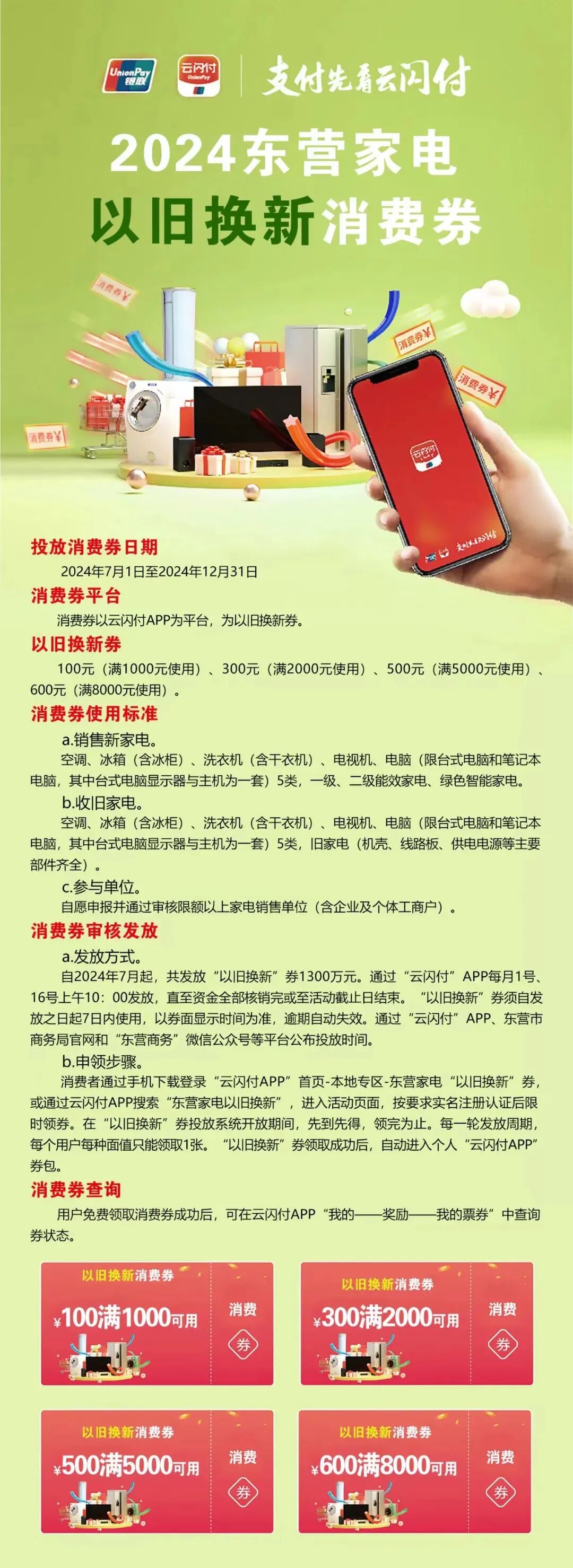 7月1日(星期一)上午10:00,東營市家電以舊換新券開始第一輪投放,消費(fèi)者可通過手機(jī)下載登錄“云閃付APP”進(jìn)入活動(dòng)頁面,按要求實(shí)名注冊認(rèn)證后限時(shí)領(lǐng)券。從7月份起,“以舊換新”券通過“云閃付”APP